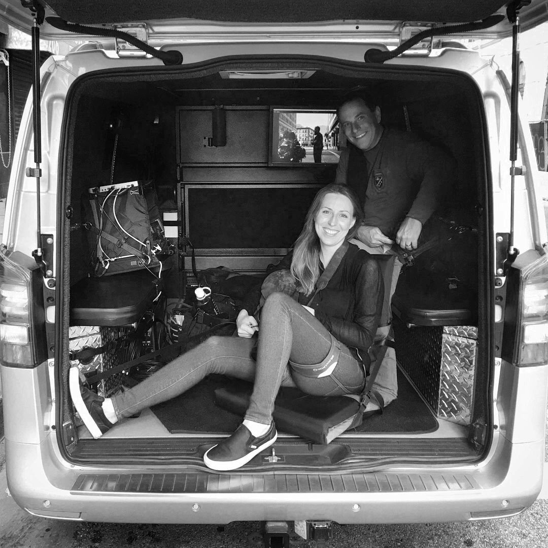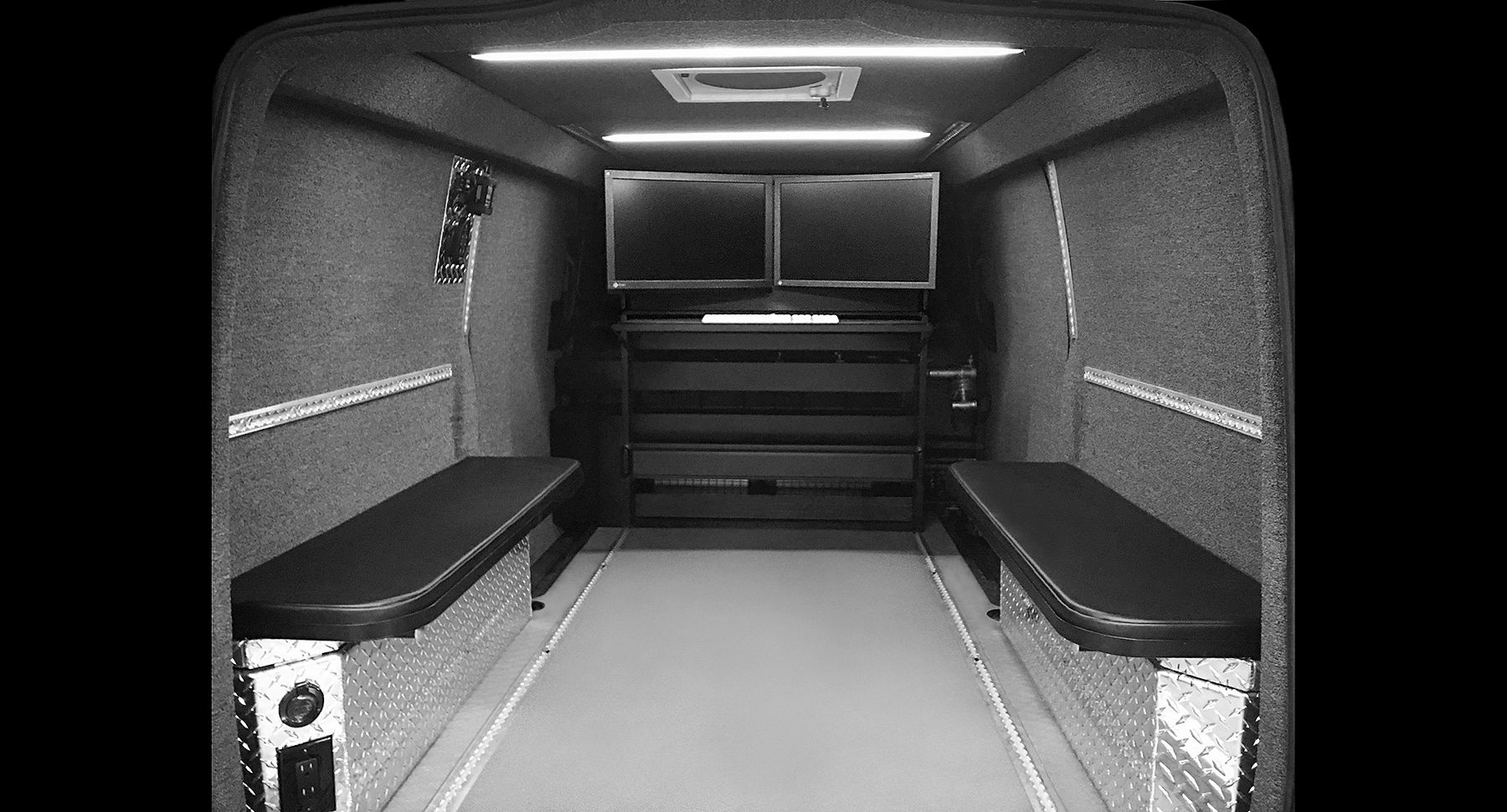 Mobile Capture/Video Village Van. FEATURES - (2x) Built-In 24” Eizo Monitor Mounts | Built-In Flip Up Desk Top | Color Correct LEDs | (2x) Padded 4ft. Bench Seats | 2’x4’ Table Seats 2 - 4 people | (2x) Stereo Bluetooth MegaBoom Speakers | Maximum Heat Insulation | Reversible Ceiling Mounted Fan | 750W Pure Sine Wave Battery Inverter | Externally Mounted 110v Shore Power Outlet | 2000W Suitcase Generator plus 2 Gallons Fuel | 16 cu.ft. Roof Mounted Thule Cargo Box | INCLUDED: 100 Miles/Day